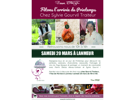 Le samedi 20 mars 2021 de 10h à 16h Pierre Oteiza et Alexandre viennent vous rejoindre pour fêter l'arrivée du printemps chez Sylvie Gourvil Traiteur. Retrouvez-nous au 1 Rue de Morlaix à Lanmeur pour découvrir les jambons, salaisons, charcuteries, cassoulets, fromages et vins du Pays-Basque et partager un moment de convivialité !