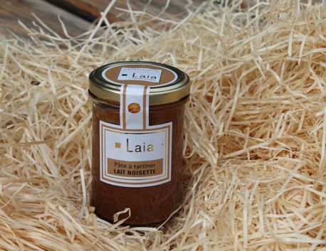 La pâte à tartiner Laïa est composée de pâte de noisettes (46%), sucre, pâte de cacao, lait en poudre, beurre de cacao, lécithine de soja (1%)
