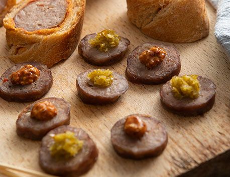 En apéritif, ajoutez une touche de fleur d'ail sur vos saucisses confites tranchées.
