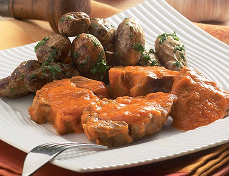 Ferme et fondante à la fois, la Langue de Porc Basque se marie parfaitement à notre sauce aux piquillos adoucie par la crème fraîche et les oignons rissolés. Réchauffée à feu doux, elle s'accompagne de petites pommes de terre sautées à l'ail et au persil ou d'un gratin de pomme de terre cuisiné avec les micros dés de chorizo.