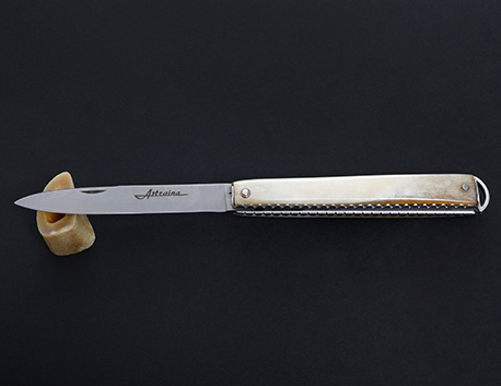 Artzaina est un couteau créé et fabriqué par les Couteliers Basques. Tout comme Hezurra, ce modèle exclusif en os de jambon issu du jambon Kintoa AOP, a été créé spcécialement pour Pierre Oteiza.