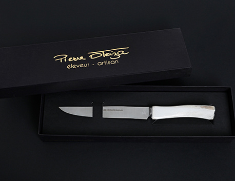 Son manche est en os issu du jambon du Kintoa et sa lame est en acier inoxydable *. Comme le couteau Artzaina, Hezurra est présenté dans un coffret signé Pierre Oteiza.