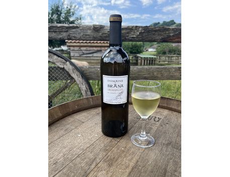 Ce vin blanc du Domaine Brana a une couleur légère aux reflets verts. Ce vin est aromatique et a un bel équilibre en bouche.